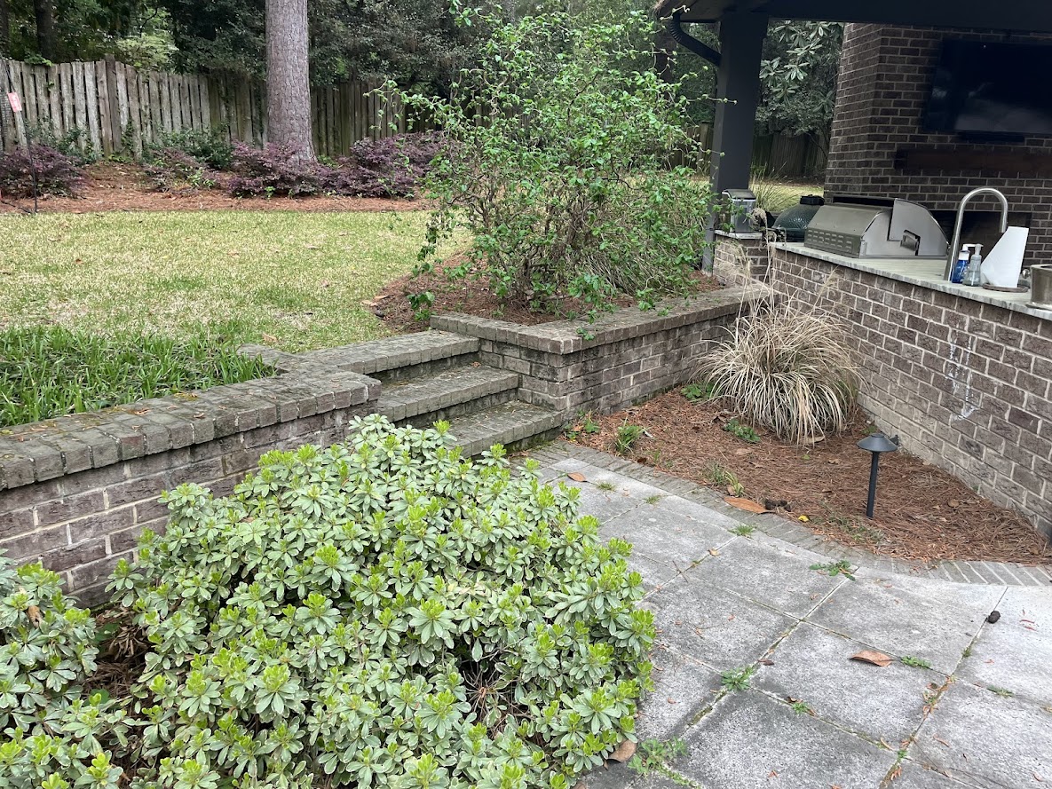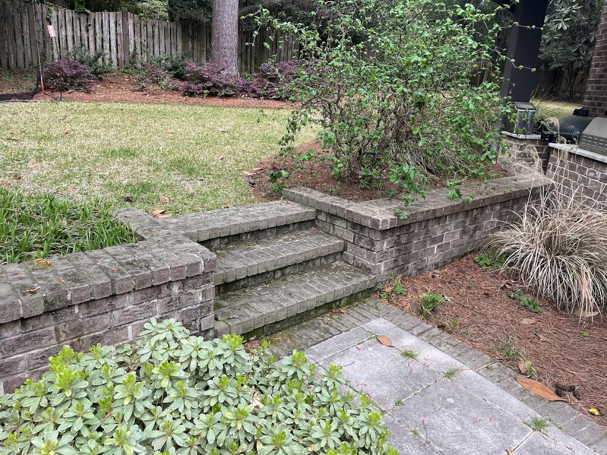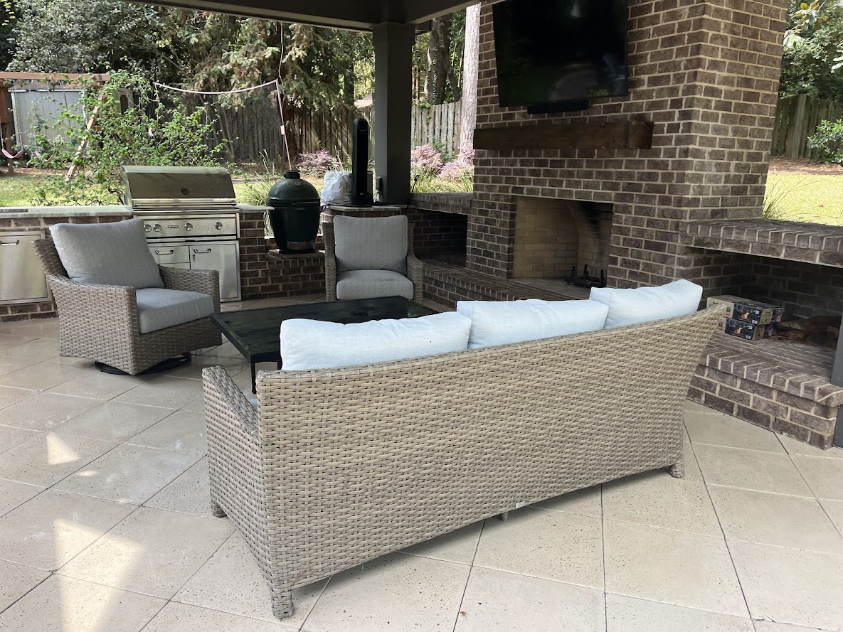 This patio in Forest Acres needed a little TLC, Lakeside Softwash from Chapin, SC performed a gentle but thorough softwash to clean every surface. The patio floor, which is travertine, had accumulated dirt and grime over time. The surrounding brick border, steps, and landing pads also needed attention, as did the brick under the gazebo and the white brick patio walls. All of the patio furniture was cleaned as part of the project.