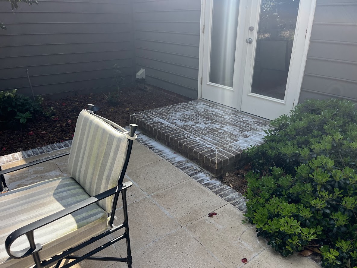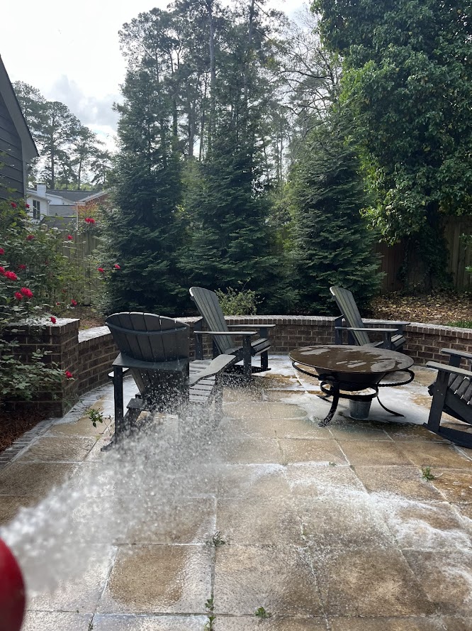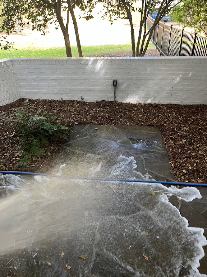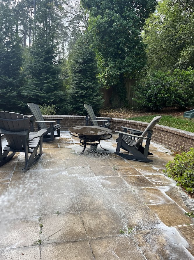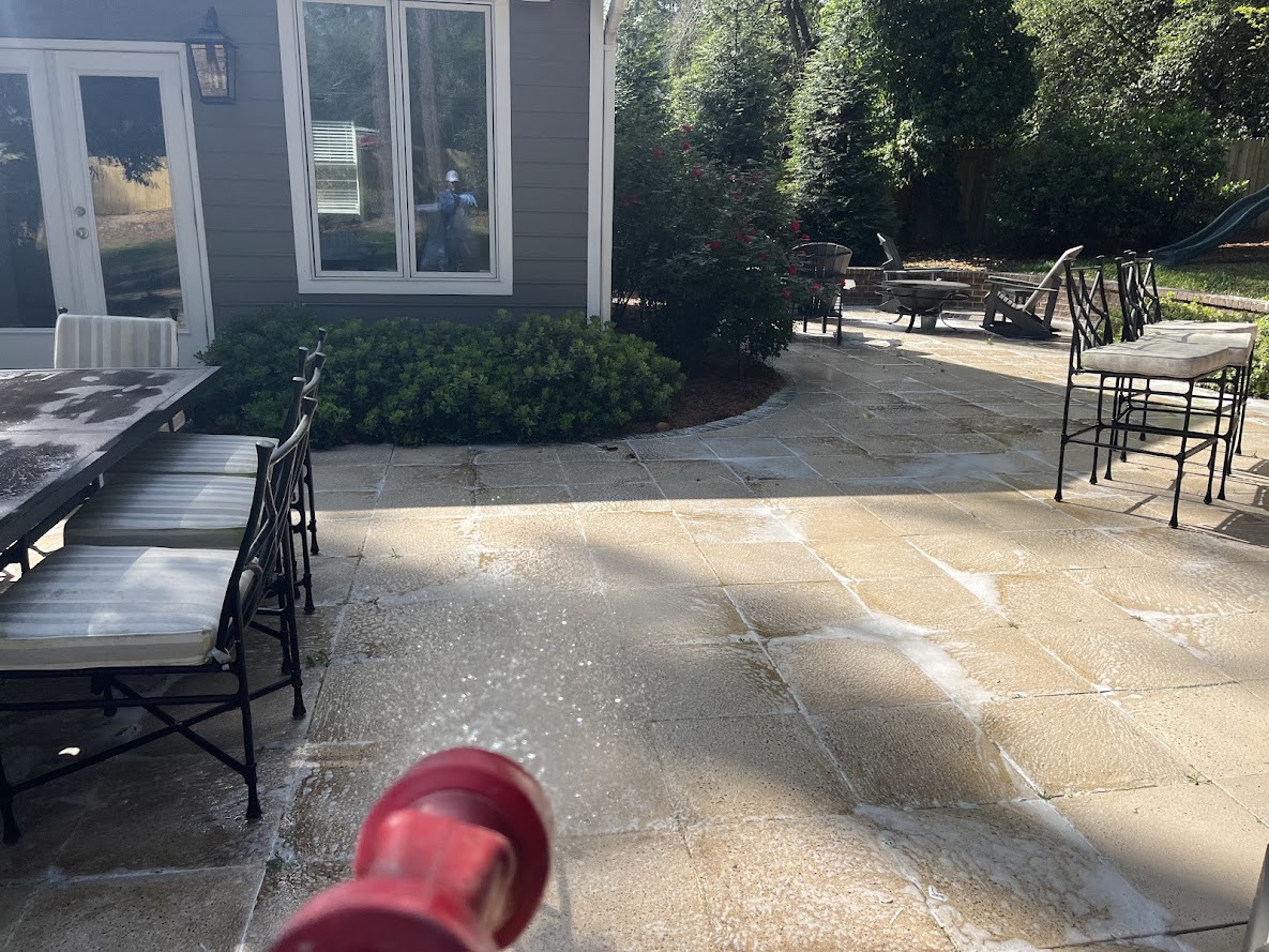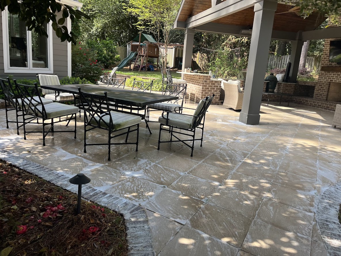 The process began with applying a cleaning solution evenly across all of the treated areas. Applying the solution allows it to penetrate and loosen the dirt and grime without aggressive scrubbing or high-pressure water. After the solution had time to work, we rinsed the surfaces to wash the loosened contaminants away. This combination of solution application and rinsing proved to be both effective and safe for the various patio surfaces.