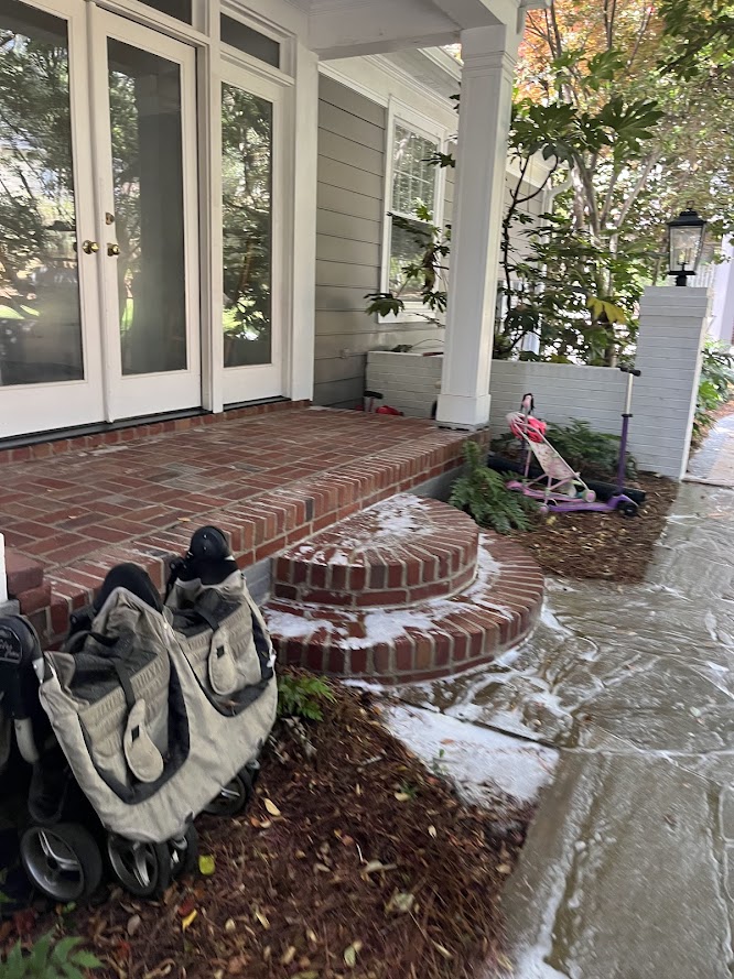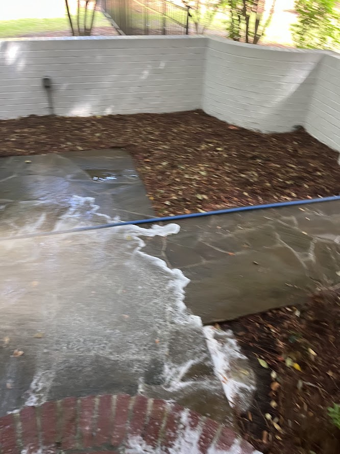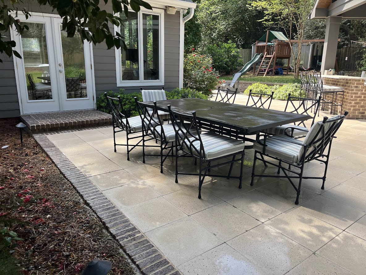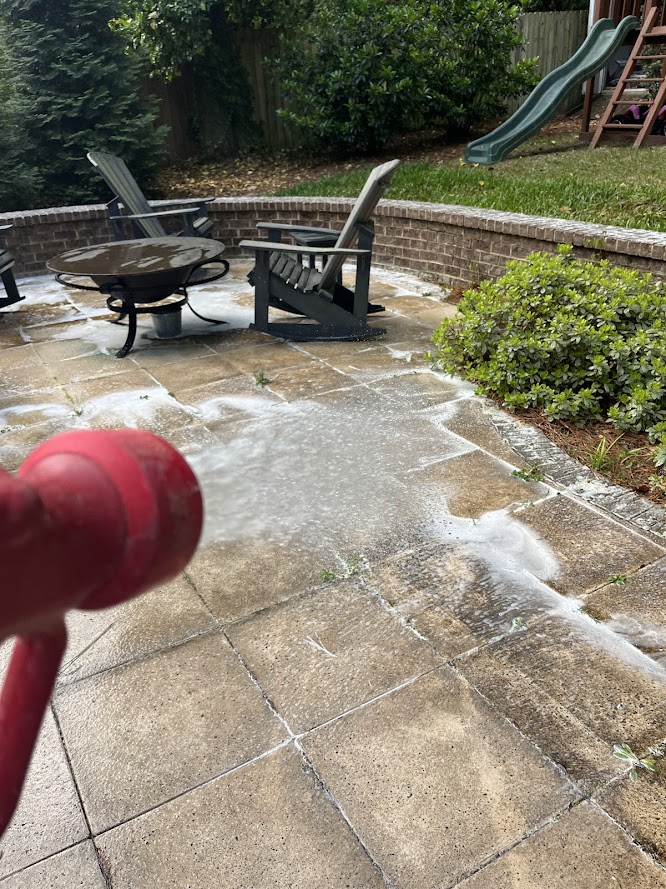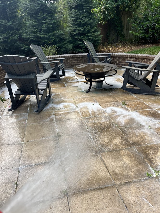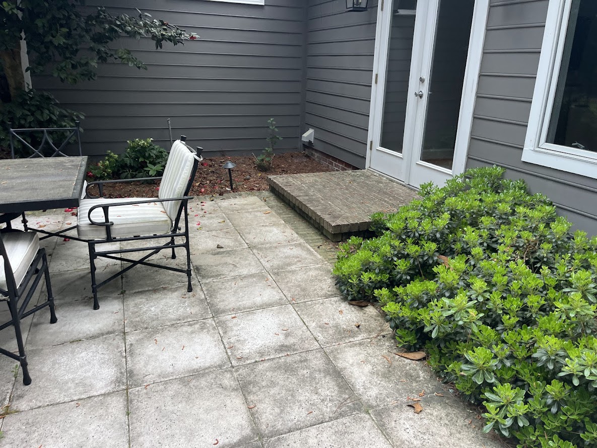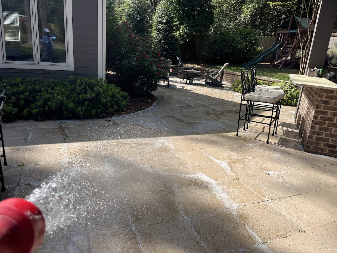 The process began with applying a cleaning solution evenly across all of the treated areas. Applying the solution allows it to penetrate and loosen the dirt and grime without aggressive scrubbing or high-pressure water. After the solution had time to work, we rinsed the surfaces to wash the loosened contaminants away. This combination of solution application and rinsing proved to be both effective and safe for the various patio surfaces.