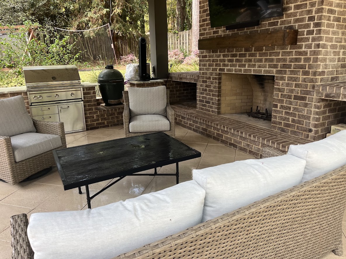 Because no pressure was used, the brick and travertine were not subject to the erosion or pitting that can occur with pressure washing. The patio furniture was also cleaned carefully, with the same softwash method, so fabrics, finishes, and delicate parts were not at risk. Cleaning under the gazebo and along the brick walls helped restore a consistent look across the whole outdoor living area.